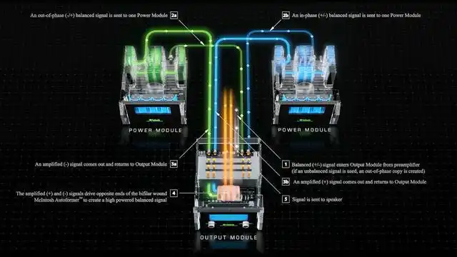 McIntosh 功率放大器采用三箱体结构:音频电路分别位于两个箱体之间,第三个箱体(带有蓝色仪表的那个)包含单端 RCA 和平衡 XLR 输入以及扬声器输出。多个扬声器输出不适用于三线制连接;它们分别标记为 2 欧姆、4 欧姆和 8 欧姆,因此用户可以将扬声器连接到最接近其标称阻抗值的那个。