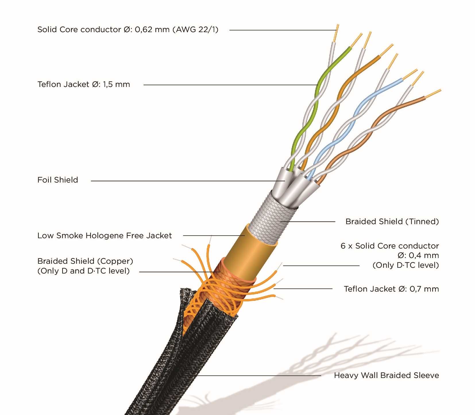 网路线都采四对八股设计,Ansuz使用直径0.62mm单芯铜作为导体,每股导体外都先以铁弗龙做第一层绝缘包覆,总直径为1.5mm。接着两股成一对以铝箔包覆屏蔽,然后用编织屏蔽将四对导体再一次包覆起来。再来于线材外面以低烟无卤(low smoke halogen free)的材料最外层包覆,此材料在线材内部受热时不会排出有毒气体,增加使用安全性,最终在外面最后一层为黑色厚实的编织套。 .