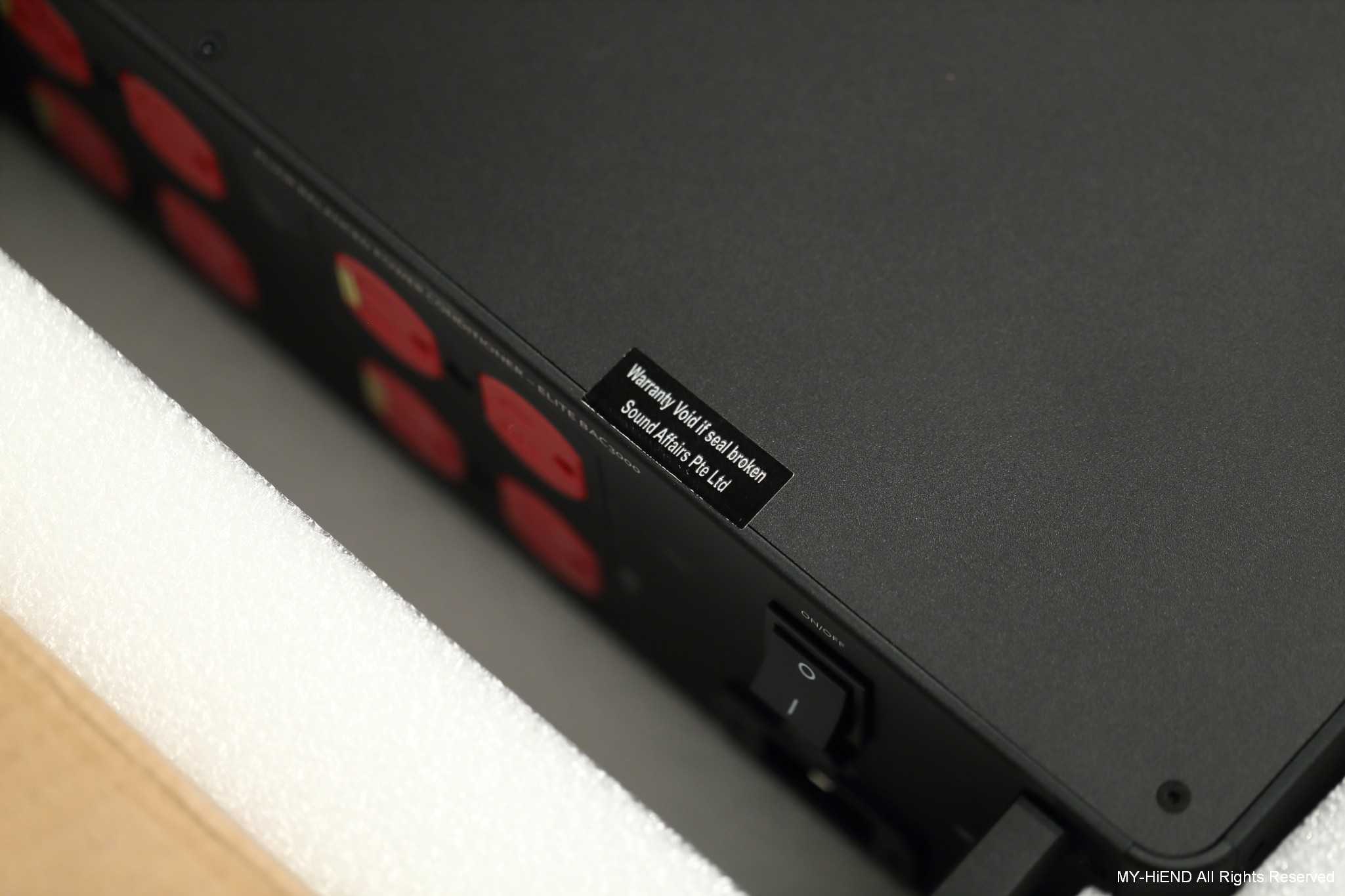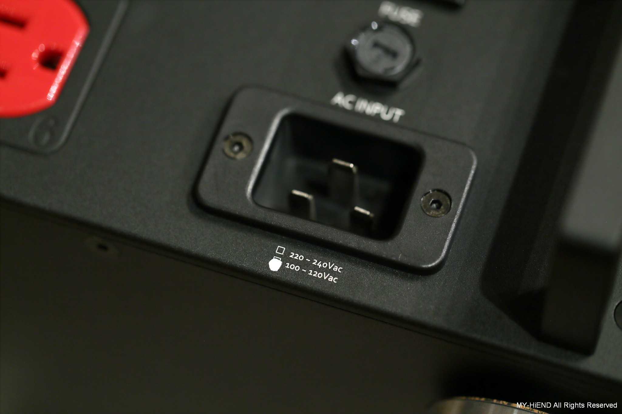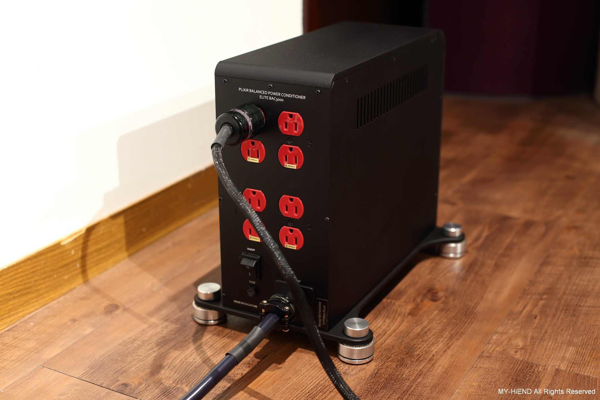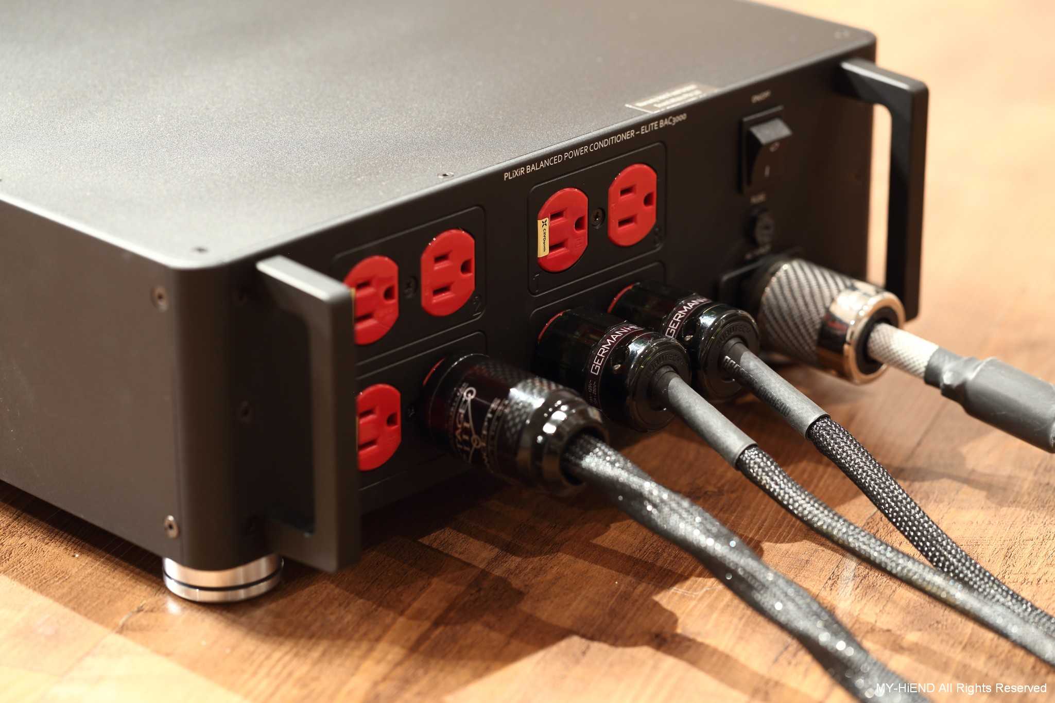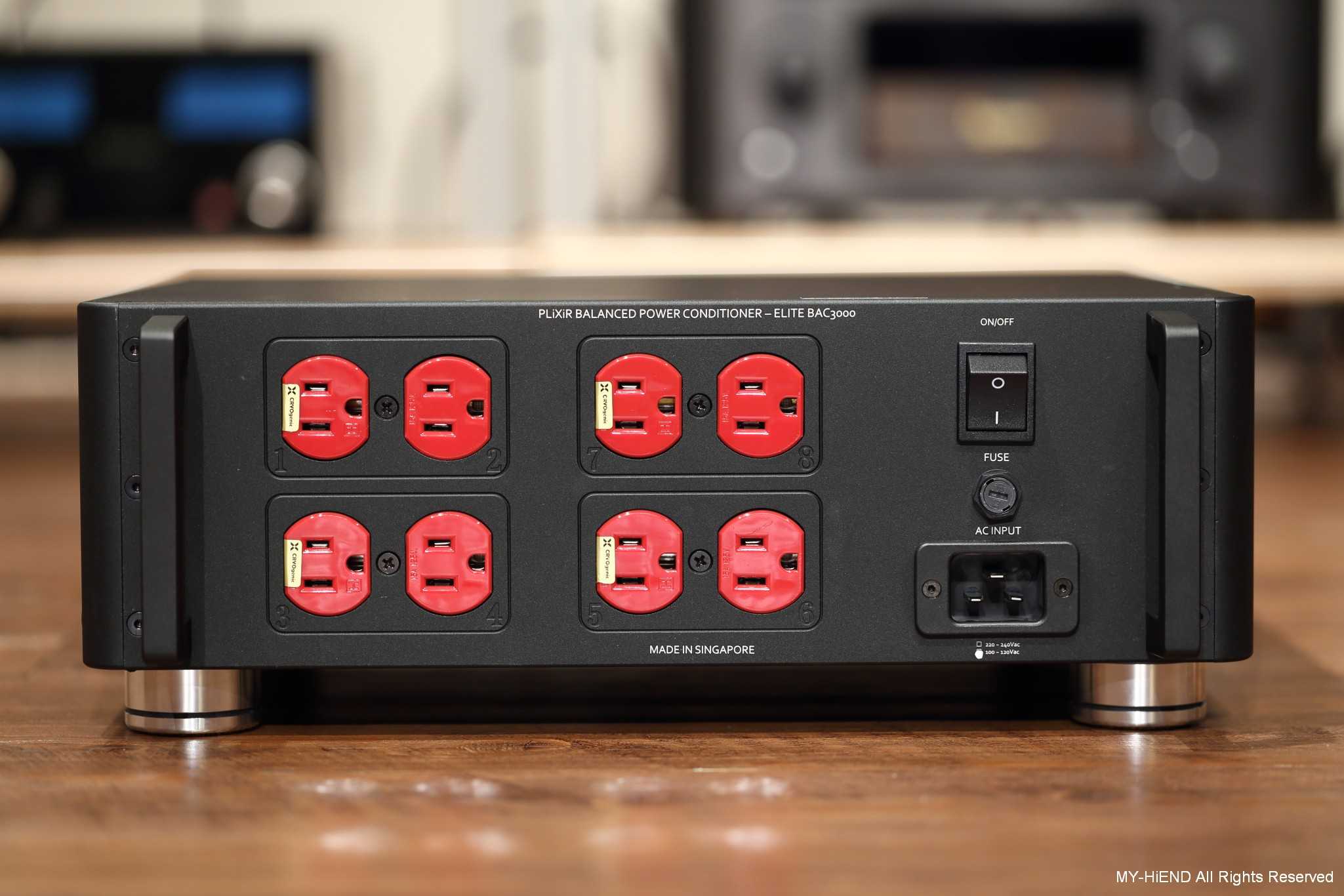 Elite BAC 3000的背面,共有8个AC插座输出,采用日本制医疗级的PLiXiR PLUS-D插座,一般版是黑色的,这里插座是红色的是因为这是已经升级为经超冷(Cryo – deep cryogenic process)处理过的。 PLiXiR PLUS-D插座传导金属部份使用纯铜合金,本体为抗热与能吸收振动之阻尼材料,据厂方表示,这是他们比较无数次、反覆聆听后最中性、最透明、音乐最为自然流畅的插座。