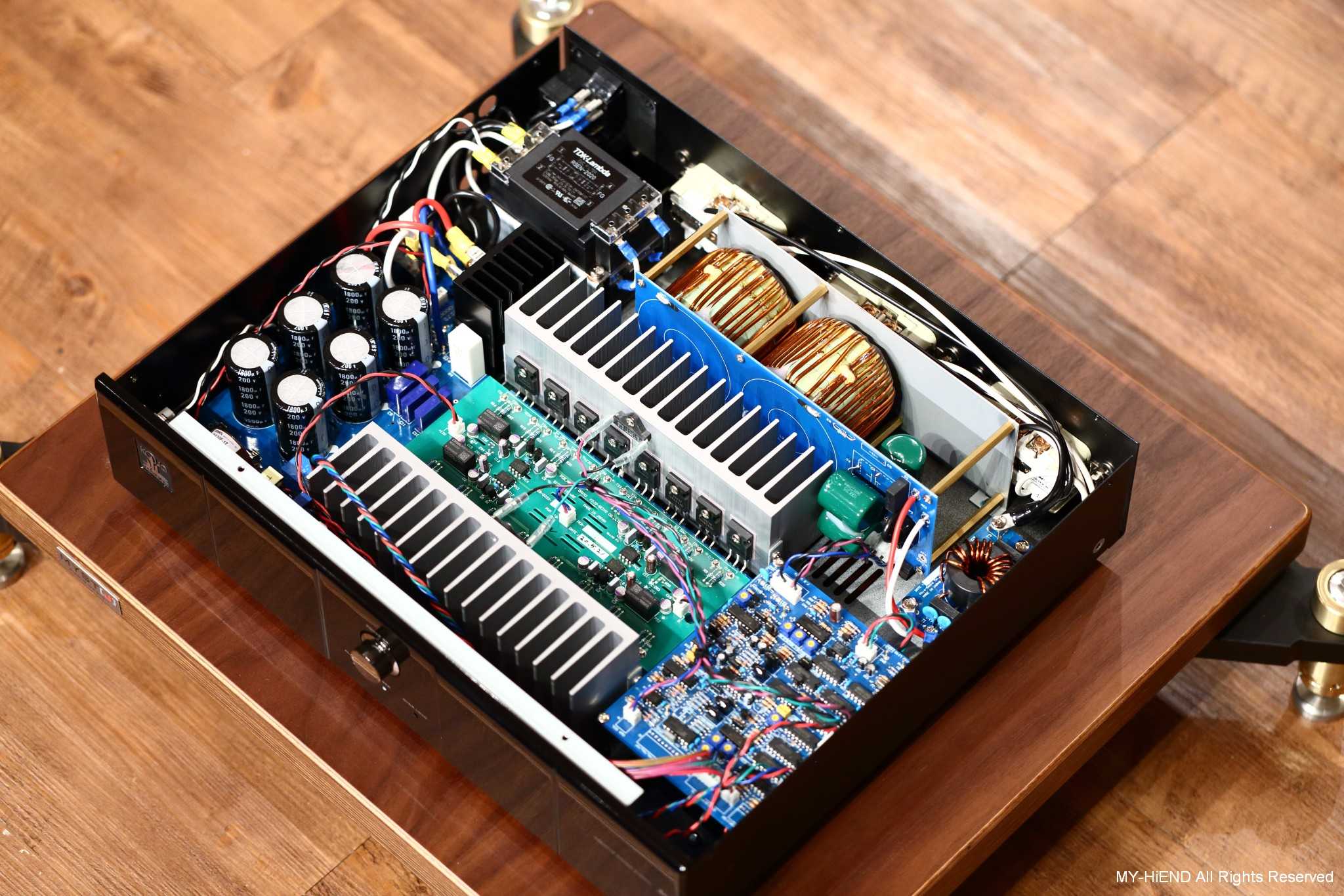 打开Aray MKII用料可是满满,不说还以为是一台扩大机,市电进入后就先使用EMC Filter进行滤波,再来是6颗1800uF低阻抗高承受能力滤波电容处理后才进入核心PWM转换,两旁的大型散热片与8对IGBT绝缘闸双极电晶体相当醒目,两颗金铜色的低通滤波(Low-pass Filter)负责过滤波形失真,扼流圈核心采用99.99%高纯度电解铁制作,其尺寸比一般产品大上许多。